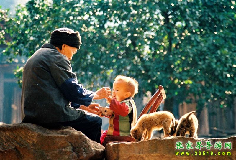 孩子們自從娘胎里出來,父母們就給備好了一首首童謠。在襁褓中時,有簡短的搖籃曲。“我的小寶貝,睡吧快快睡,你莫哭,快長大,我的小寶貝”,伴以“喲嗯”之類的喉音和鼻音??摁[的孩子在這低低的吟哦中,在這輕柔的春風中,會緩緩的走入夢鄉(xiāng)。到孩子牙牙學語時,就會換上新的內容。為讓孩子從小懂得廉恥,大人會教孩子《蟲蟲兒飛》:“打板板,逗蟲蟲兒,蟲蟲兒飛,飛到嘎兒(外公)去。嘎兒不趕狗,咬到蟲蟲兒的手;嘎兒不殺雞,蟲蟲兒不回去;嘎兒不打蛋,蟲蟲兒不吃飯;嘎兒不殺鵝,蟲蟲兒不過河。”(土家把孩子名字叫得賤,喊成“蟲蟲兒”)。在唱的同時手把手地教孩子做蟲蟲飛的動作。唱完后,又會用手指點點孩子的左右臉,刮一下孩子的鼻子,“這兒也丑,那兒也丑,鼻子刮豬油。”意思是好吃是丟臉的,蟲蟲兒可不能這樣。勤勞是做人的根本,也是土家人的傳統(tǒng)美德,“三歲看大,八歲看老”,大人會教些勤勞的童謠?!顿u豆腐》道:“一顆豆子圓又圓,推成豆腐賣成錢,別人講我生意小,小小生意賺大錢。”為讓孩子自小懂得親疏,教孩子《推磨》:“推磨拐磨,推的粑粑白不過。推粑粑,接嘎嘎,嘎嘎不吃娃娃的酸粑粑;推豆腐,接舅舅,舅舅不吃娃娃的酸豆腐;推合渣,接姨媽,姨媽不吃娃娃的酸合渣……”夏日的夜晚,一家人出來在月亮地里歇涼,有夜火蟲(螢火蟲)舉著火把飛來,母親會以夜火蟲打頭,以“一問一答”的聯(lián)句方式,考考孩子的記憶力:“夜火蟲,夜夜來,嘎婆接你吃茶來。什么茶?豆茶。什么豆?黃豆。什么黃?朱砂黃……”