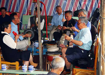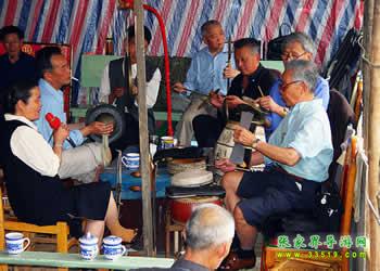 圍鼓(含嗩吶)。又稱打鎦子、打排鼓,是民間紅白會(huì)中不可缺少的樂(lè)器。一般7人演奏,樂(lè)器有一鼓、一大鑼、一公鑼、兩副鈸、兩嗩吶。其詞曲紅白會(huì)通用,以鼓和嗩吶上系紅、白布為分別標(biāo)記(結(jié)婚不打“四字鈸”曲)。史傳的圍鼓詞有《撩子》、《火鋪》等,《撩子》分《一二三》、《閃翅》、《堆羅漢》、《反落花》等十章,《火鋪》也分《三槍》、《四進(jìn)門》、《八哥洗澡》、《蓮魚吐絲》等十章,嗩吶詞有《八十正宮》調(diào)等。在農(nóng)村,圍鼓是最普及的樂(lè)器,每逢紅白喜事都有圍鼓和嗩吶表演。