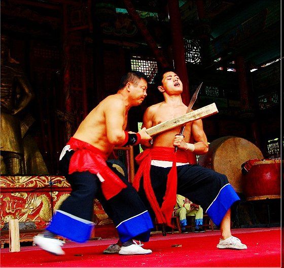 大庸氣功 大庸氣,堪稱武林奇葩,曾為祖國(guó)贏得聲譽(yù),海內(nèi)外享有極主名望。 大庸氣功是大庸各民族特別是土家族傳統(tǒng)體育項(xiàng) 目之了,分健體氣派、武術(shù)氣功兩類。前者有“返還 功”、“馬王推氣功”、“少林達(dá)摩醫(yī)療保健氣功” 等;后者有靜坐、壁虎、靈子、二指彈、碎石、松靜 、硬氣、五禽、五陽(yáng)功等,尤以硬氣功著稱。大庸硬 氣功,歷史悠久,漢代相單程,明代覃后,清代劉明 燈,當(dāng)代湯子模、周鐵鞭、杜心武、趙繼書等都具有 超人硬氣武功。大庸土著民族在漫長(zhǎng)的反征服、反壓 迫斗爭(zhēng),博采武當(dāng)、少林南北派、昆侖派眾家武林精 華,創(chuàng)造出獨(dú)此一家的大庸硬氣功。 據(jù)傳,大庸硬氣功鼻祖是楚國(guó)鬼谷子。《永定縣 志》有關(guān)鬼谷子隱居天門山鬼谷洞潛心學(xué)《易》、傳 授方術(shù)的記載。到清代有武林高手朱茂嶺,隱居三岔 村北芭蕉灣洞,研究鬼谷氣功之術(shù),后收西溪坪胡口 子、余世萬(即“余通人”)為徙,傳其衣缽。余通 人將武術(shù)氣功系統(tǒng)整理,發(fā)揚(yáng)光大,播名于世。 新中國(guó)成立后,黨和政府十分重視民間氣功發(fā)掘 整理,并正式列為體育項(xiàng)目加以普及發(fā)展,今日大庸 市習(xí)練硬氣功達(dá)數(shù)萬人眾。永定區(qū)官黎坪村世有“硬 氣功之鄉(xiāng)”盛譽(yù),該村男女老幼,練功已蔚成風(fēng)氣, 其武師趙繼書,1979年先后參加全省和全國(guó)武術(shù)大賽 ,均獲一等獎(jiǎng),受到國(guó)家體委重視,同年7 月趙繼書 專程到北京給中央領(lǐng)導(dǎo)同志匯報(bào)表演。嗣后,隨同中 國(guó)武術(shù)代表團(tuán)和國(guó)家領(lǐng)導(dǎo)人先后兩次出國(guó),到盧森堡 、意大利、比利時(shí)、羅馬尼亞、馬其他和東南亞等國(guó) 家訪問。他表演的臥刀碎石、頭頂開石、雙鳳灌耳、 頭碰石柱、叉尖推磨等精彩節(jié)目,博得外國(guó)友人好評(píng) 。盧森堡一位榮獲國(guó)家獎(jiǎng)牌的武士,看了表演后連夜 來到中國(guó)大使館,將自己珍藏多年的獎(jiǎng)牌贈(zèng)送給他; 盧森堡國(guó)王主動(dòng)熱情走上臺(tái)與趙繼書熱情擁抱,連連 稱贊:“了不起!了不起!國(guó)際氣功大師!”并把珍 藏紀(jì)念章一枚贈(zèng)送給趙繼書。一位法國(guó)朋友十分贊賞 說:“中國(guó)的氣功,稱為全人類的寶貴財(cái)富,是有科 學(xué)道理的。”自此,大庸硬氣功譽(yù)滿全球。湖南瀟湘 電影制片廠專門拍攝了彩色紀(jì)錄片《大庸氣功》。 大庸硬氣功共有二十多個(gè)項(xiàng)目,最有影響的是: 腹臥鋼叉 由二人在地面扶住一根叉尖朝上的三 股鋼叉,叉尖猁鋒利,然后一個(gè)俯身叉尖,尖抵腹部 ,待其四肢平展懸空,扶叉二人轉(zhuǎn)動(dòng)鋼叉,謂之推磨 。表演時(shí),要求臥叉者運(yùn)氣于腹,氣意集中,稍有大 意,叉即穿腹而過。 臥刀破石 先固定兩把大刀,刀口朝上,臥刀者 運(yùn)氣后,由其他人抬臥于刀口上(有仰臥、俯臥兩種) ,然后在臥刀者腹部或背部置一碩大石條(約數(shù)百斤) ,一人或兩人輪大鐵錘狠擊石條直至斷裂破碎為止。 釘?shù)洞财剖?地上倒一層碎玻璃片,一人仰臥其 上;然后腹上置釘床,又一人仰臥釘床上,再于第二 人腹上置釘床,第三人仰臥刀床上,腹部上壓一塊數(shù) 百斤大條石,由人掄錘狠砸,至石破為止。 銀槍刺喉 用一根兩頭安有鋒利槍頭的鋼槍,抵 置兩位表演者喉部,然后相對(duì)發(fā)力,至槍桿抵成彎弓 形而喉部安然無恙。 徙手?jǐn)嗍?表演者將堅(jiān)滑如鐵一塊卵石置于石凳 (地)上,然后運(yùn)氣于掌或指擊斷(碎)卵石。 踢腿斬石 表演者運(yùn)氣于腿,以腿踢斷石條。一 般可踢斷15公分以上厚度的麻石條或青石條。 胸部打刀 將鋒利大刀刃口置于胸部肌肉上,用 一根拳頭粗木棒猛擊刀背,至棒斷而胸部無傷。 新中國(guó)成立以來,大庸民間武術(shù)與民族體育逐漸 融為一體,發(fā)揮著提高人民身體素質(zhì)、弘揚(yáng)中華武術(shù) 傳統(tǒng)和增進(jìn)國(guó)際友誼重大作用。除硬氣功外,還有數(shù) 十種武術(shù)形式散見于民間武術(shù)體育活動(dòng)之中。如打飛 棒、扭扁擔(dān)、抵搭斗杠、擠油渣、甩抱腰、舉石鎖、 板牛角(一種斗牛形式)等等。其特點(diǎn)是因地制宜, 不分場(chǎng)地,凡田園地角院壩集鎮(zhèn),都是習(xí)武練功、開 展活動(dòng)的處所,頗具泥土氣息。擬或以生活中某些動(dòng) 作和動(dòng)物的某種形態(tài),稍加模仿演繹,便成某一獨(dú)特 武術(shù)形式。如天門武術(shù)功夫大師余道人所創(chuàng)造的“宮 天梳”、“巖燕樸天門”等;也有就地理特點(diǎn)創(chuàng)造某 種武功形式的,如“蕩藤”等。 以上部分圖片均來自互聯(lián)網(wǎng),出處不詳,請(qǐng)作者與本站聯(lián)系。 |