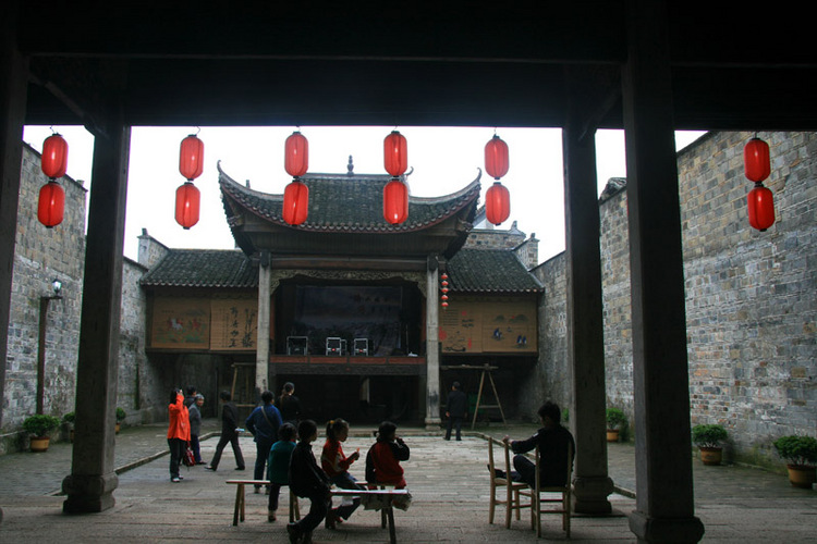 作為蘆江八景之一的臨河戲臺,當(dāng)然也得有個雅稱,古鎮(zhèn)的讀書人于是又一次開動腦筋,可是連連取了無數(shù)個都不能令人滿意。給臨河戲臺取雅稱確實有些難度。為此,地方紳士在各處貼出“征名告白”:若能給臨河戲臺取一滿意雅稱者,賞大洋十塊。頓起應(yīng)征者如云,最后,竟是來臨河戲臺唱戲的益陽班子中一名演小生的戲子得了那十塊大洋。那演小生的戲子不但戲演得出神入化,還滿腹詩書,據(jù)說他出生于書香門第,還考取過秀才,然而他卻偏偏迷上了唱戲,甘愿過四海為家的流浪藝人生活。他所取的“梨園戲水”被古鎮(zhèn)人認(rèn)可并獲賞后,他還特地作詩一首來借景抒懷,詩曰: