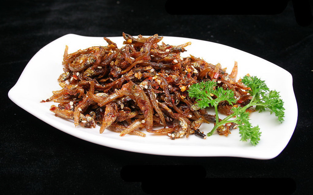 原料為小魚蝦,其中以“青皮嫩”為最佳,肉多味美,魚蝦捕撈上趁新鮮將其沖洗干凈,瀝干水,均勻地攤在熱鍋子里(鍋上刷一層油使它們不粘鍋)。半小時左右,這些魚蝦就已經(jīng)焙干,一側(cè)焦黃,透出薰香,再剔去肚腸,炒豆豉辣椒或?qū)⑶嘟非嗨馇屑?xì)同炒均好,味道絕美。