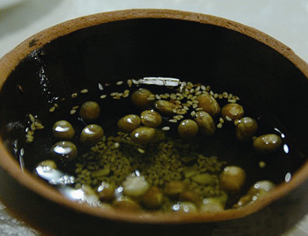 靖港人吃姜鹽芝麻豆子茶早已成為當(dāng)?shù)氐娘L(fēng)俗習(xí)慣。將生姜搗碎,加入少量食鹽和炒熟的芝麻、黃豆或黑豆,一齊倒入茶罐中,然后手提茶罐搖勻倒入茶杯待客,香脆可口,味不亞于“湘西擂茶”。