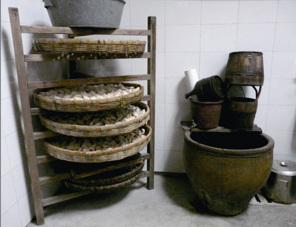 二、發(fā)酵,粉團(tuán)中合進(jìn)“老粉”,以釀帶釀。天熱時,置于案板上,蓋薄布片,使其自動發(fā)酵;天泠時,用熱水或火烤,促其發(fā)酵。待粉團(tuán)溢出一股芬香,方為發(fā)酵成功。