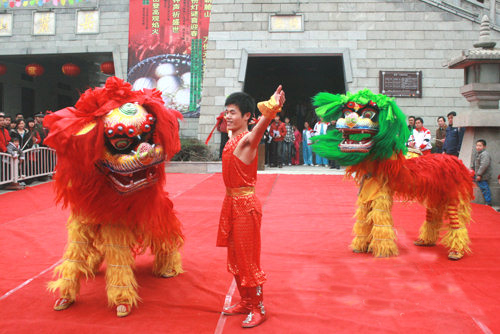 有布獅和毛獅兩種,舞時又分文獅和武獅。文獅刻畫獅子溫馴神態(tài),動作詼諧細(xì)膩;武獅顯獅子勇猛,動作幅度強(qiáng)。舞獅的套子有“藤纏樹”、“烏云蓋雪”、“牛戀凼”、“泥鰍彈鍋”、“麒麟送子”等。用打擊樂和吹奏樂伴奏、氣氛熱烈莊重。舞獅時還有贊獅者伴唱,唱詞內(nèi)容有反映勞動生活、祝賀吉祥、介紹傳說故事等,舞獅者隨唱詞內(nèi)容和節(jié)奏進(jìn)行表演。