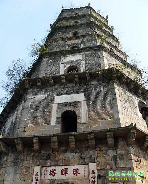 塔高10丈5尺,磚石結(jié)構(gòu),七層八棱,石階旋梯。正門西南向,上方漢白玉橫額鐫刻著斗大楷書“珠暉塔”三字,兩邊漢白玉雕刻楷書對(duì)聯(lián):“高峙船山遠(yuǎn)綿學(xué)脈,流回耒水廣助文瀾”。塔基四周刻有飛禽走獸圖形,塔內(nèi)拱門嵌有石刻碑文,為江蘇學(xué)政王先謙撰寫、寧夏知府黃自文手書,原為6塊,現(xiàn)存4塊。塔前建有廊廡,僧房數(shù)楹。塔尖銅頂,映日生輝。
