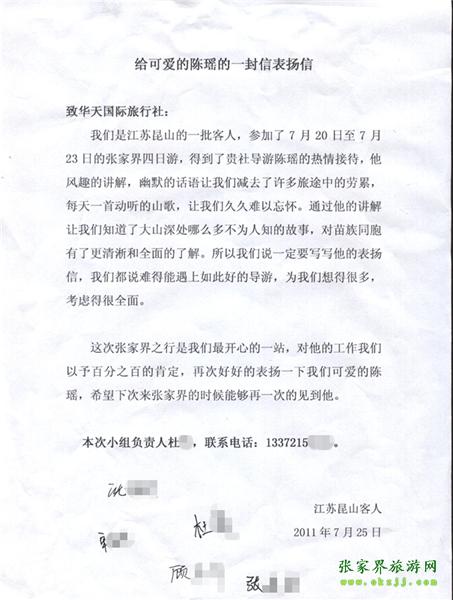- 游客夏先生為表?yè)P(yáng)導(dǎo)游李姣姣寫(xiě)來(lái)表?yè)P(yáng)信致我張家界... [14811]