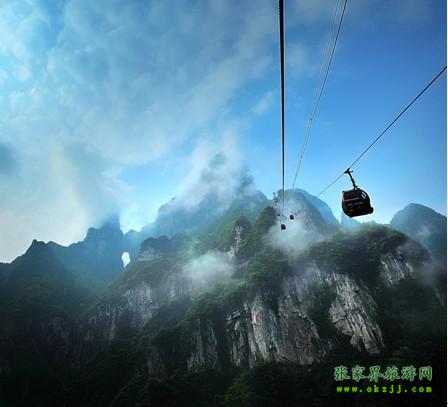 ![]() 纜車從天門山主峰云夢(mèng)仙頂至天門山寺前櫻桃灣廣場(chǎng),總長度800米,單程運(yùn)行約10分鐘,為無遮蓋的雙人吊椅式,是天門山山頂?shù)囊粭l絕佳空中觀景長廊。乘坐纜車緩緩飄行在林海之上,絕美的空中原始花園盡收眼底,白云裊裊,滿目碧翠,時(shí)有飛鳥在腳下掠過,時(shí)有樹梢花朵似探手可及。神仙般的瀟灑飄逸和無比的心曠神怡讓人流連忘返。